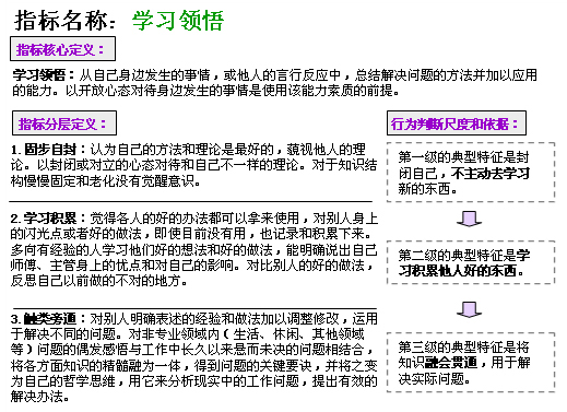 能力素质的第三个特征是可客观具体衡量。实际上,总结能力素质的过程也就是一个订定行为标准的过程。某一种能力素质需要什么样的行为表现,这些行为表现又如何从低到高逐层反映该能力素质的强度。