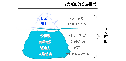 让我们引用“冰山”来说明能力素质的特点,能力素质这座“冰山”是由“知识、技能”等水面以上的“应知、应会”部分,和水面以下的“价值观、自我定位、驱动力、人格特质”等情感智力部分构成的。知识技能等明显、突出并且容易衡量,但真正决定一个人的成功机会的,是隐藏在水面以下的因素,它们难以捕捉,不宜测量。可是如果不去挖掘这些因素,无异于舍本逐末。